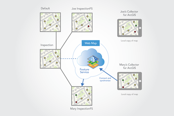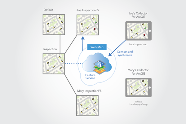 To do this, a web map is available in the company's organizational account for members of the office workers group. A worker who is a member of this group can access the web map using Collector running on one of the available devices in the office. Before leaving the office, the worker downloads the map using Collector. The worker then goes into the field and inspects the requested updates. Corrections are made in the field using Collector. When back in the office, the worker's corrections are synchronized with the feature service, and reconciled and posted with the default version.